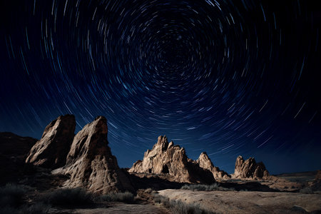 Captivating view showcases star trails swirling above rugged rock formations in a desert landscape during a long exposure shot against a dark night sky.