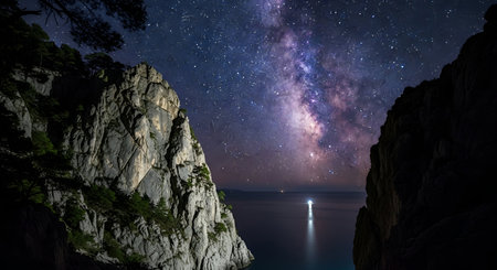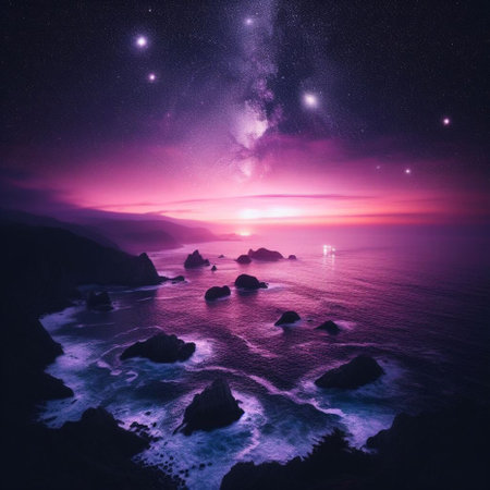 Coastal landscape at night, towering rock formations under a vibrant, starry sky
