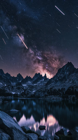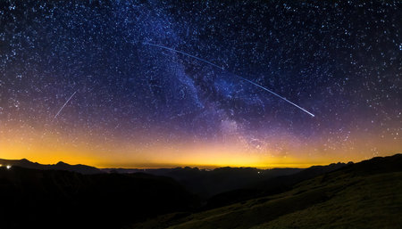 Spectacular meteor shower lights up the night sky with bright streaks over mountain landscape