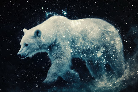 Double exposure of an animal with the night sky, stars blending into its fur, creating a mystical effect