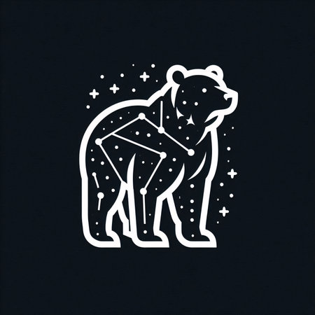 A bear is laying on a rocky surface in the dark. The bear is surrounded by a starry sky, giving the image a sense of mystery and wonder