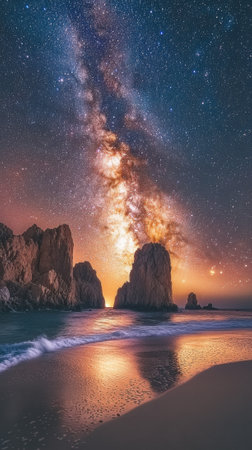 A breathtaking view features the Milky Way arching brightly in the night sky above rugged coastal rock formations. Gentle waves ripple on the sandy beach under beautiful celestial light.