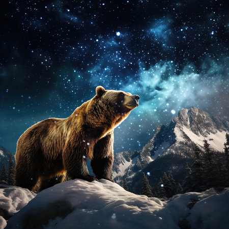 Mountain range northern lights starlit night gigantic brown bear Generative AI