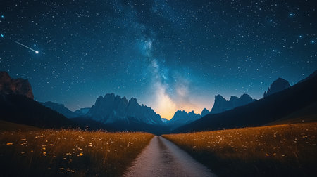 Dolomites landscape, night sky with the Milky Way and a shooting star, award-winning photo in the style of James Balog --chaos 30 --ar 16:9 --stylize 750 --v 6.1 Job ID: a1d80813-82ac-4b04-99f0-1e26f4ed7f64