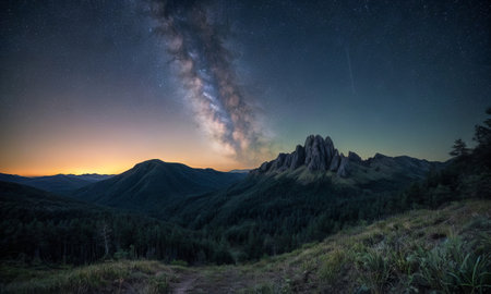 A stunning view of a vibrant sunset sky features a shooting star streaking across the twilight horizon. This captivating mountain landscape showcases the beauty of nature as stars twinkle above, creating a peaceful and serene atmosphere perfect for inspiring adventure and relaxation.