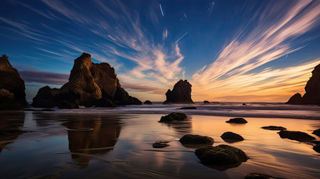 Bright meteors streaking across a stunning night sky filled with countless stars create a magical scene above a tranquil ocean, framed by rugged rocky cliffs in the background