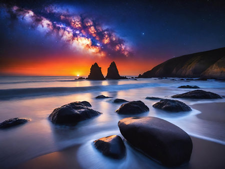 Milky Way and Ocean Long Exposure at Twilight.Epic, serene image of the Milky Way galaxy over a vibrant orange horizon and coastal rocks, with smooth, misty water effect.