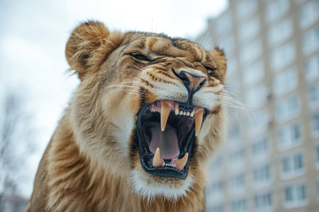 Close-up of a lioness roaring, displaying sharp teeth, with a blurred urban background