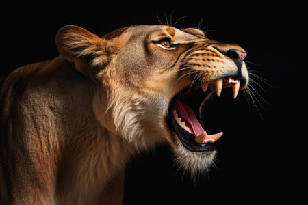 Close up side profile portrait of beautiful mature female African lioness yawn over dark background, low angle view