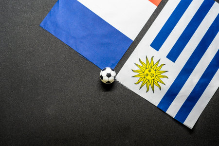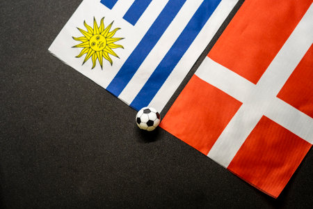 Uruguayan flag in city street with soccer ball poster on background. Uruguay country national emblem.