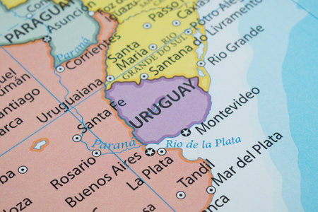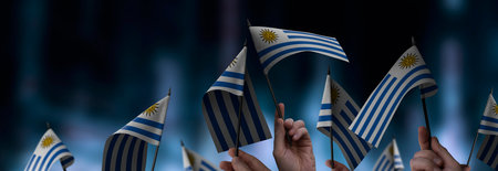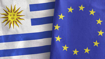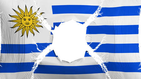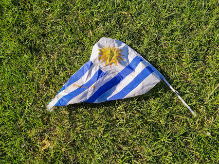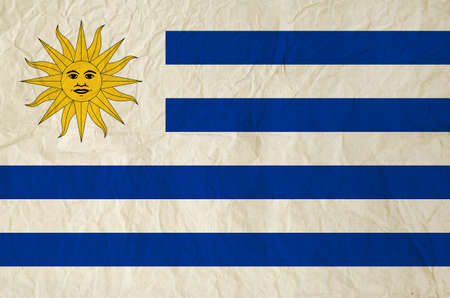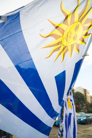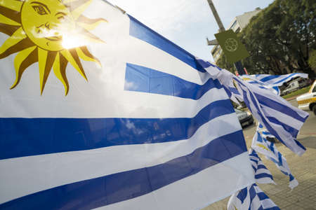 Uruguayan flag in Montevideo city street market background. Uruguay country national emblem.