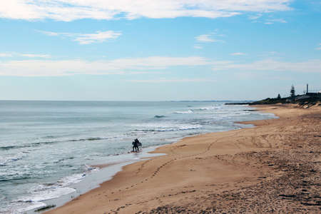 Lone surfers at west Australian beach Bunbury on cloudy afternoon in winter