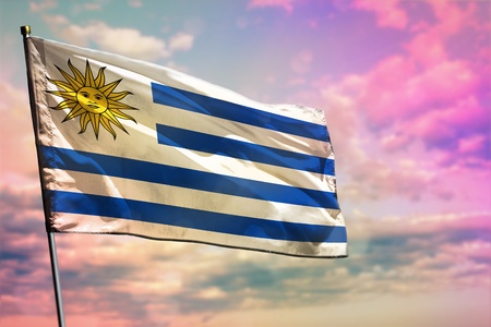 Fluttering Uruguay flag on colorful cloudy sky background. Uruguay prospering concept.