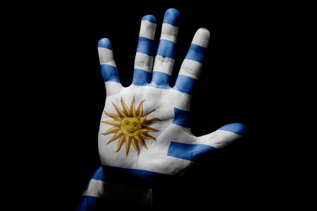 Rude man hand with flag of Uruguay in stop sign to anger, discrimination, racism, abuse on black background.