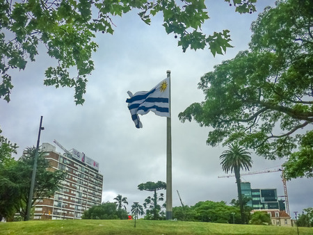 Low angle view of uruguayan flag in a park called plaza de la bander in the city of Montevideo, Uruguay.
