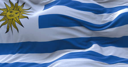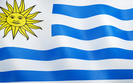 Uruguay national flag fluttering in the wind on a sunny day. 9 horizontal stripes: white and blue alternated, with Sol de Mayo in white square. 3d illustration render.
