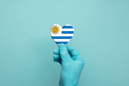 Hands wearing protective surgical gloves holding Uruguay flag heart