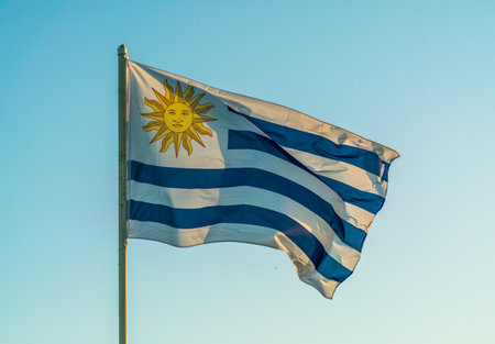 3D rendering of Uruguay flag waving on blue sky background, Uruguay is a South American country known for its verdant interior, Uruguay celebrates Independence Day as a public holiday on August 25