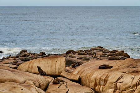 Colony of South American fur seal, Arctocephalus australis, on the cliffs of Cabo Polonio at the Atlantic coast of Uruguay with waves and surf in the background, Uruguay, South America