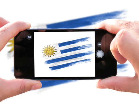 brush painted flag of Uruguay. The hands of men make a photo from the phone. Shooting from the smartphone.