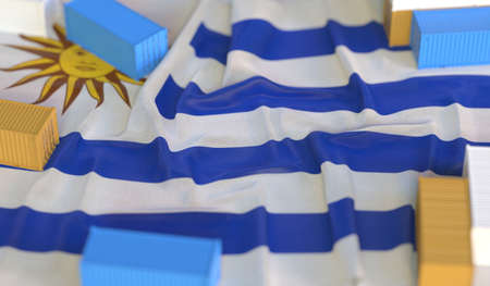 Cargo containers and flag of Uruguay, production or cargo delivery related 3D rendering