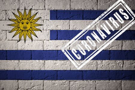 Flag of the Uruguay with original proportions. stamped of Coronavirus. brick wall texture. Corona virus concept. On the verge of a COVID-19 or 2019-nCoV Pandemic.