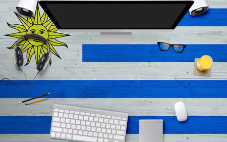 Uruguay flag background with headphone,computer keyboard and mouse on national office desk table.Top view with copy space.Flat Lay.