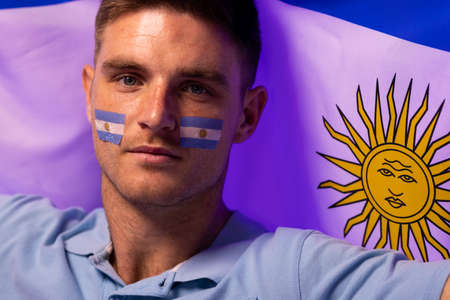 Portrait of happy caucasian male supporter with flag of argentina over pink lighting. Sport, movement, training and active lifestyle concept.