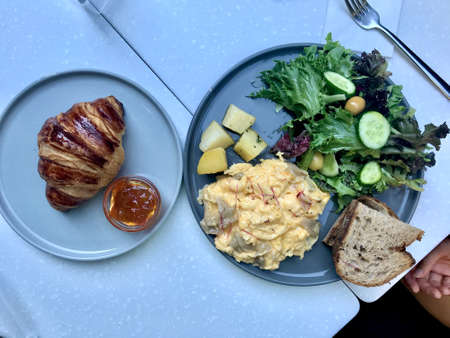 Breakfast Plate with Scrambled Egg, Mushroom, Croissant, Sourdough Bread and Salad at Cafe Restaurant.