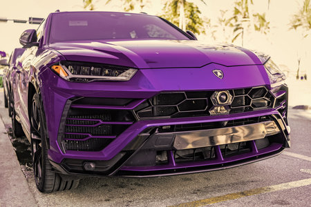 Miami, Florida, USA - November 23, 2024: blue Lamborghini Urus 2020 SUV sportscar. Luxury sport car of Lamborghini Urus SUV type. Car Lamborghini Urus parked outdoor. Lamborghini Urus, low corner view.