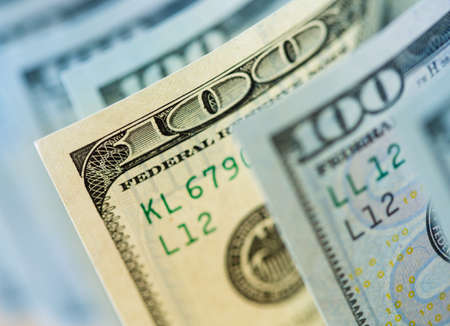 Close up view of one hundred dollar banknotes. American money background