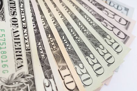 Fan of money. American dollars on a light background. 20, 10, 5 and 1 dollar banknotes