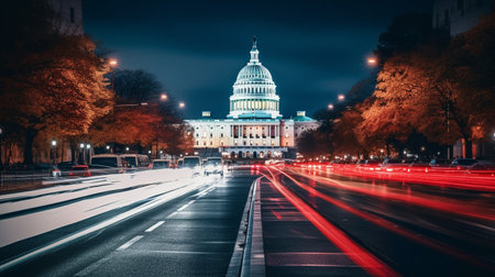 Washington DC night landmark. USA Senate with night lighting. Panorama of the US Capitol. Iconic Capitol dome in the evening. Night cityscape of US Capitol building. Capitol under night sky.