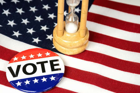 Vintage American election badge with VOTE text and American flag design. Isolated on white backdrop. Concept of electoral participation, national elections, voter motivation, democracy, civic pride