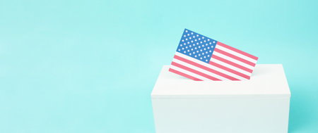 No people shot of USA flag, pins, pens and papers on table at polling station, copy space