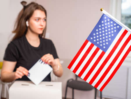 Young woman is putting vote bulletin in ballot box during elections in united states of america