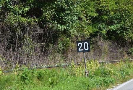 Speed limit sign on the asphalt road. Numbers 20.