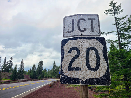 U.S. Route 20 Junction in Rural Forested Road at Eye Level