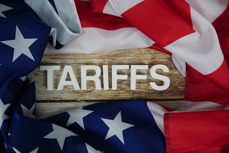 Tariffs alaphbet letters with usa flag on wooden background