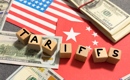 A red basket displaying a dollar bill and a sign reading tariffs sits atop flags of the USA and China, indicating the tension in global trade politics and economics.