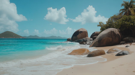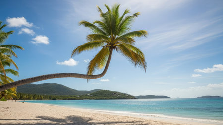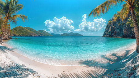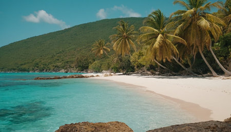 The scene features a stunning coastline with soft white sand and vibrant turquoise water, surrounded by verdant hills under a sunny sky. It captures the beauty of nature.