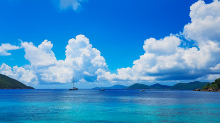 Panorama of virgin islands bay. Yacht staying on bay with cloudy blue sky