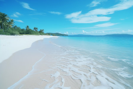Tropical Beach with Clear Water and White Sand A pristine tropical beach with soft, white sand stretches into the turquoise