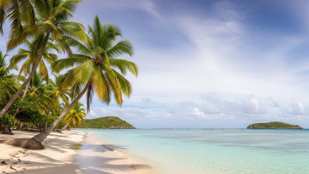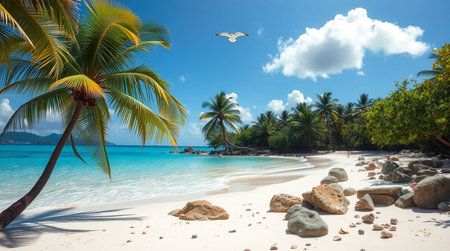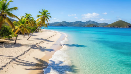 A serene beach showcases vibrant turquoise waters lapping at golden sands. Tall palm trees sway gently in the warm sun, creating a peaceful tropical atmosphere perfect for relaxation and serenity.