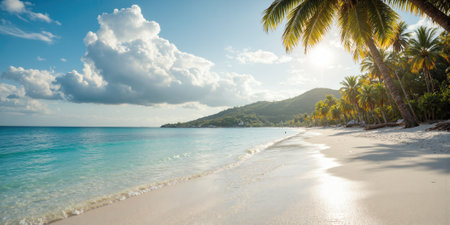 The image showcases a tranquil tropical beach with turquoise waters and golden sands, surrounded by lush greenery and fluffy clouds under a bright blue sky.