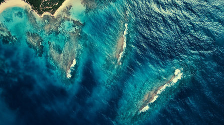 An aerial view of a tropical ocean with turquoise waters and white sand beaches.