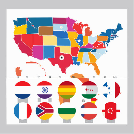 A vibrant and colorful vector illustration depicting a stylized map of the United States above a collection of international flag icons.