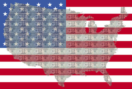 map of USA against twenty dollar bills and American flag