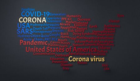 Concept of Corona Virus or COVID-19 related text cloud on the map of The United States of America (USA)