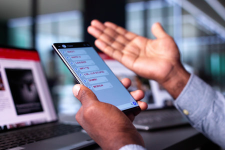 Mobile game in phone or live streaming video about fps gaming or esport. Gamer playing first person shooter online with smartphone. Man watching stream. Fun hobby and digital entertainment concept.